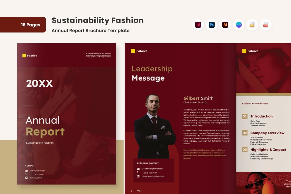 This is a chic and stylish annual report template tailored for sustainable fashion reports. It incldues 16 editable pages, inspired by editorial mag-layout, and is bundled with eco-luxury motifs for an elevated corporate aesthetic. The template is compatible with Adobe InDesign, Illustrator, Photoshop, and Canva.